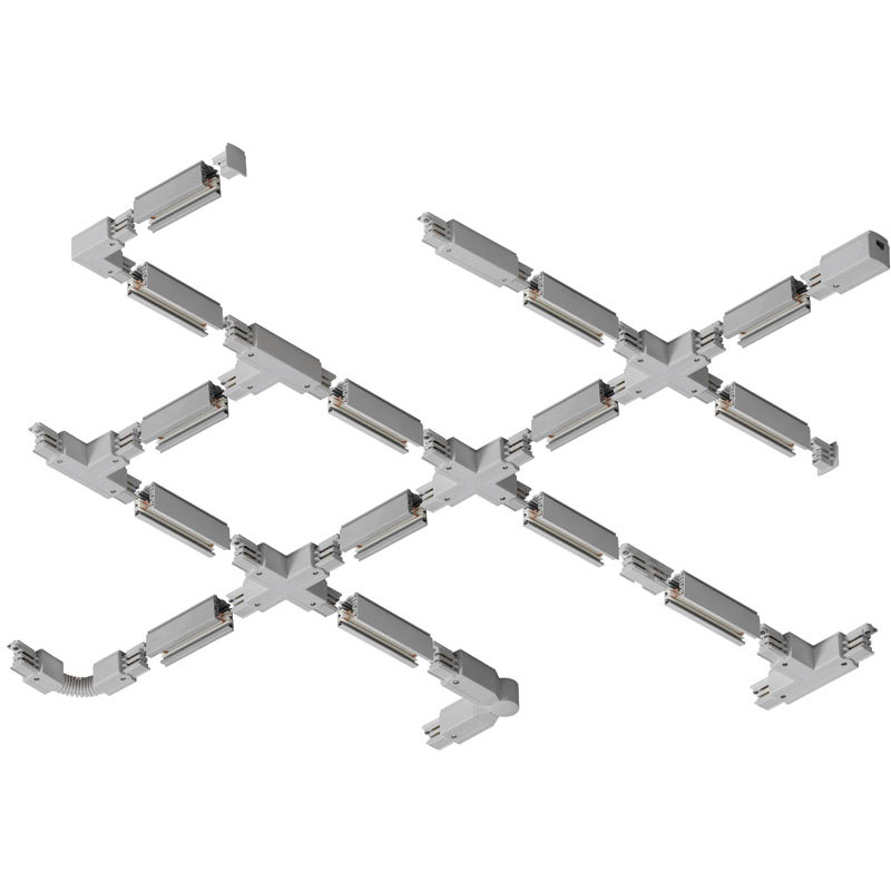 I større lokaler, som f.eks. butikker, vælger man ofte at opbygge et støtteskinnesystem, som dækker hele lokalet. Det rækker at have en tilslutning i den ene ende. I de andre ender opsætter man 90 graders L-koblinger eller T-koblinger osv, for at opbygge et net af skinner, som dækker lokalet på den ønskede måde. Billedet nedenfor giver et overblik over alle delene i Tracs skinnesystem.