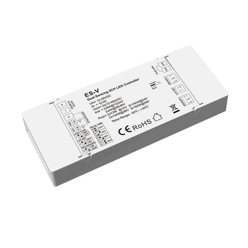 Kontrollenheten kopplas in mellan transformator och ledlister. Den klarar upp till 2x144W för 24V ledstrips. Till kontrollenheten kopplas en eller två av våra 5 olika typer av sensorer. Sensorerna kan sedan användas för att tända, släcka och dimra inkopplade ledlister.
