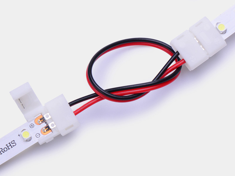 Kontakt med 15cm kabel för att koppla in ledtejp. Kontakten låses på kopparbläcken med en hasp. Genom att använda kontakten slipper man löda fast sladdar. Istället spänner man fast kontakten på ledtejpen och andra änden av sladden kan kopplas till sockerbit för vidarekoppling eller till plint på dimmer eller transformator.