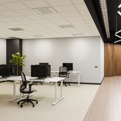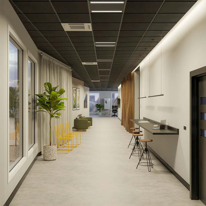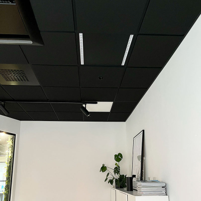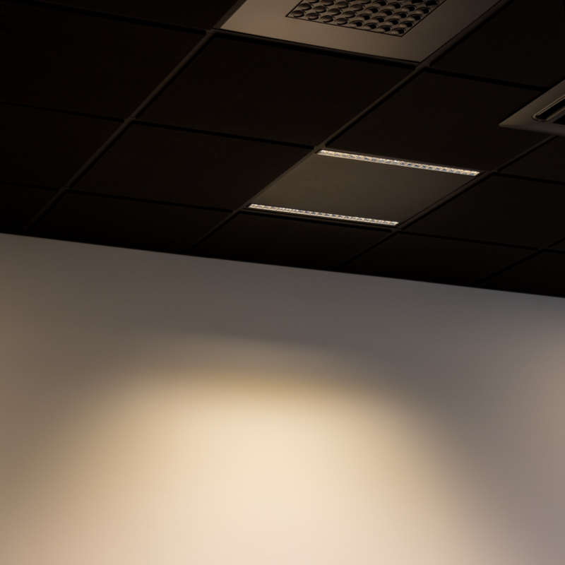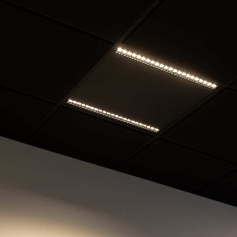 Trio LED-panel är en ny typ av armatur för akustiktak med 600x600mm paneler. Den består av två spår med ljusmoduler som ger ljus. Däremellan är panelen svart och passar bra in i svarta innertak.