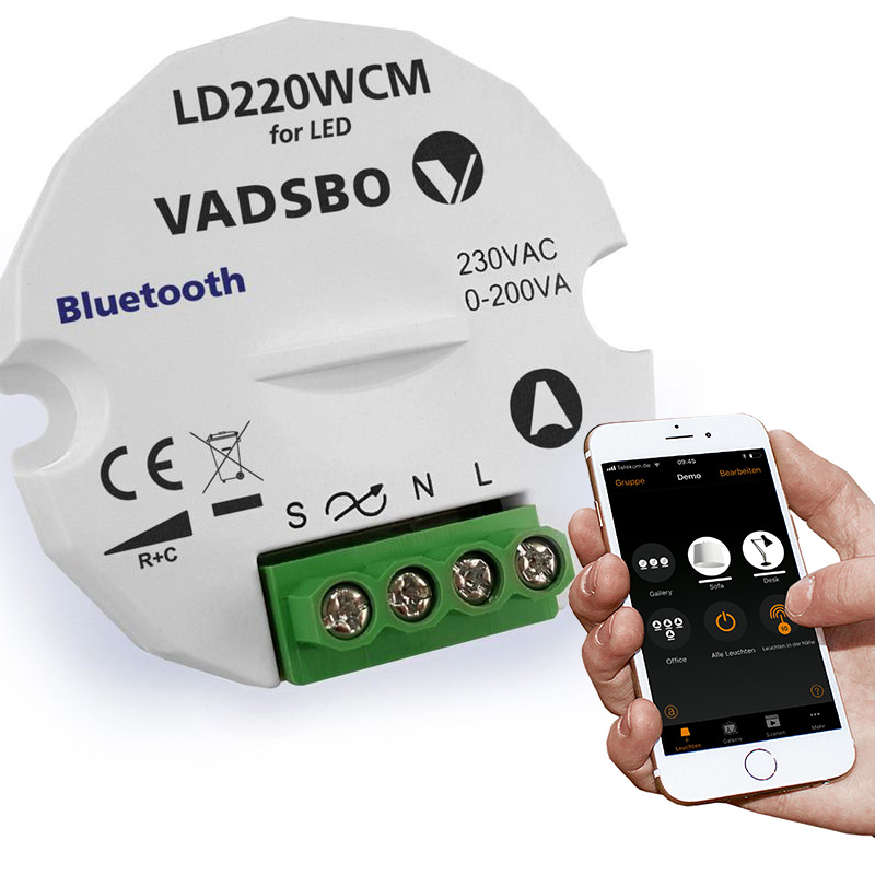 Liten dimmer puck för montering i eldosa. Dimring styrs via återfjädrande strömbrytare och trådlöst via Casambis app för mobiltelefoner. Appen är gratis och kopplar upp via bluetooth mot dimmern.